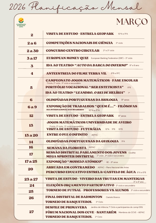📅 Já está disponível a planificação das atividades para o mês de março!Ao longo das próximas semanas, os nossos alunos vão participar em diversas iniciativas pedagógicas,…