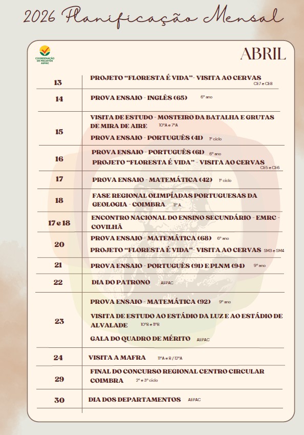 📅 Já está disponível a planificação das atividades para o mês de abril!Ao longo das próximas semanas, os nossos alunos vão participar em diversas iniciativas pedagógicas,…