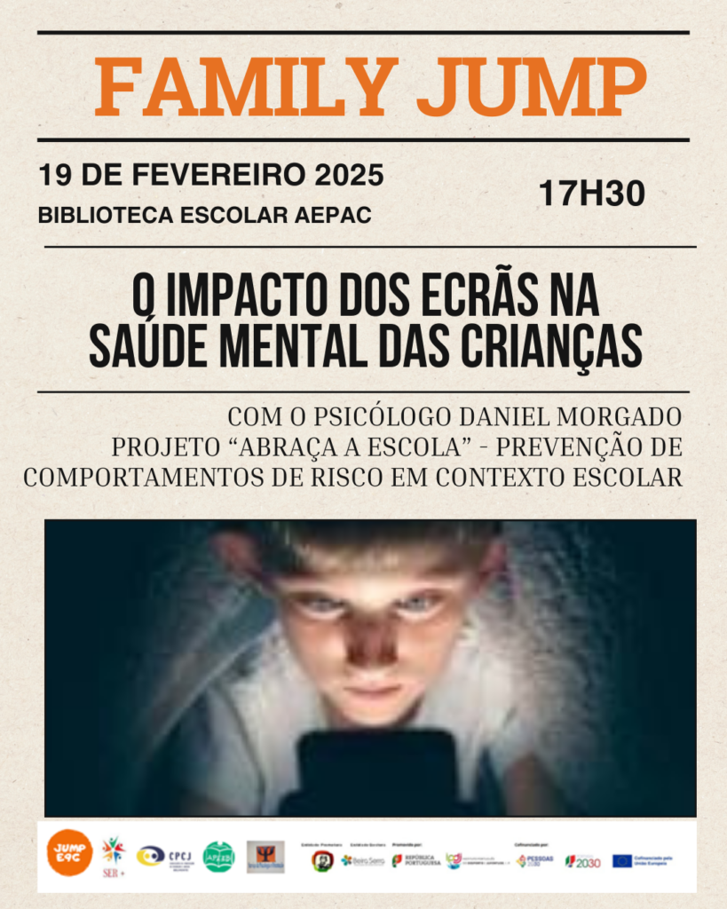 No âmbito da envolvência da comunidade educativa, terá lugar a ação de sensibilização para pais e encarregados de educação, subordinada ao tema “O Impacto dos Ecrãs na Saúde Mental das Crianças”, dinamizada pelo psicólogo Daniel Morgado, no âmbito do projeto Family Jump. Esta iniciativa visa apoiar as famílias na compreensão dos desafios associados ao uso excessivo de ecrãs e na adoção de estratégias equilibradas.