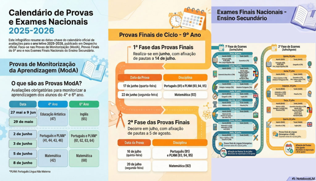 Despacho n.º 14616-A/2025, de 9 de dezembro – Aprova o calendário, para o ano letivo de 2025-2026, das provas de Monitorização da Aprendizagem, das provas finais do ensino básico, das provas de equivalência à frequência do ensino básico, dos exames finais nacionais do ensino secundário e das provas de equivalência à frequência do ensino secundário.