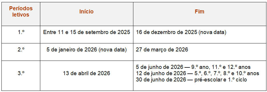 - Férias de Natal: 17 de dezembro de 2025 a 2 de janeiro de 2026
