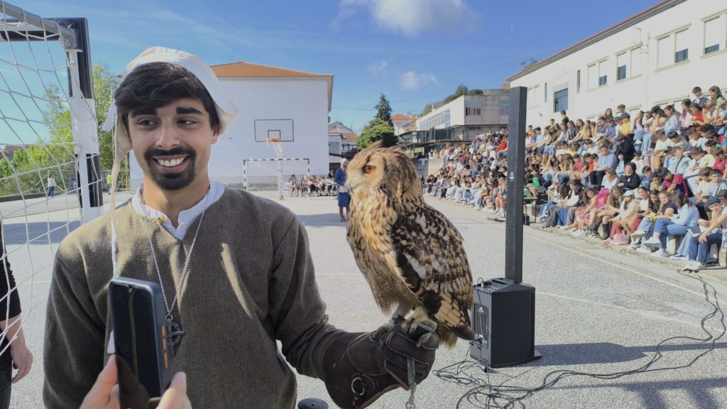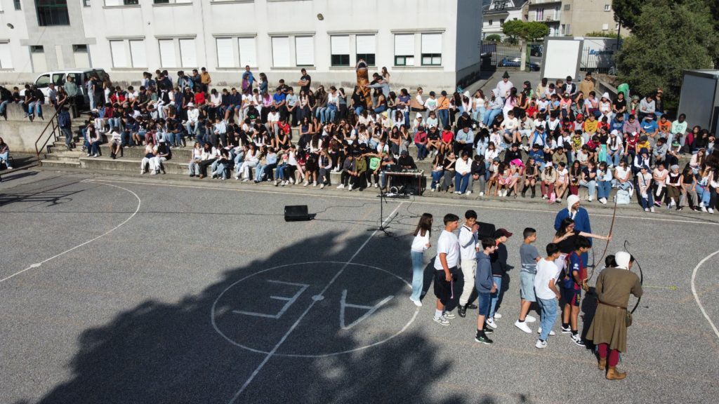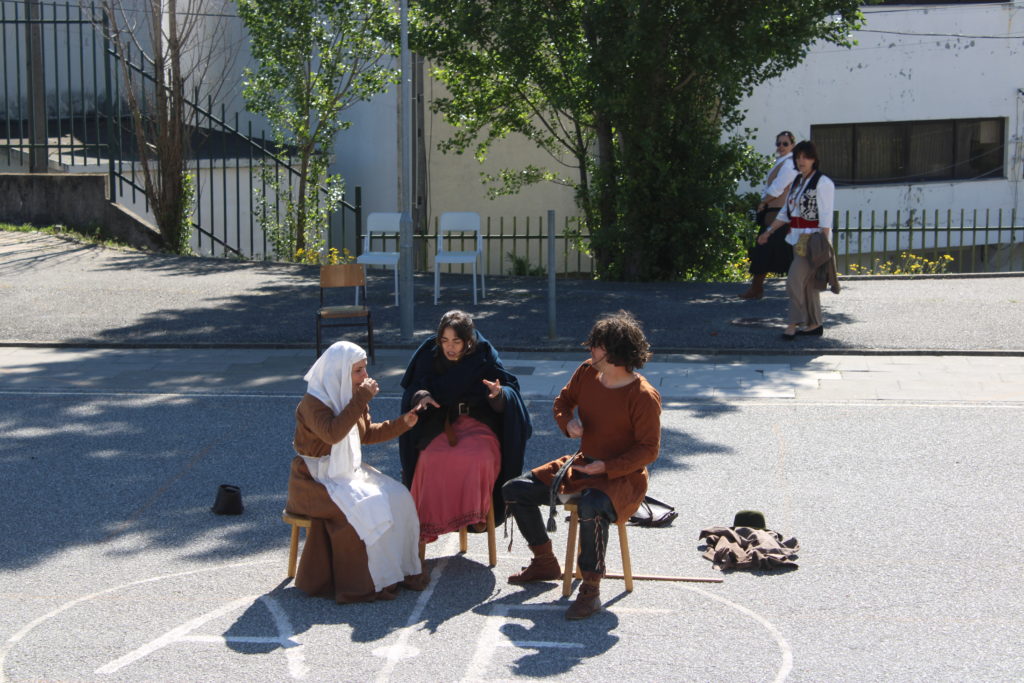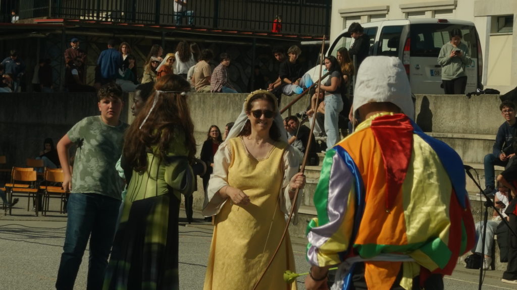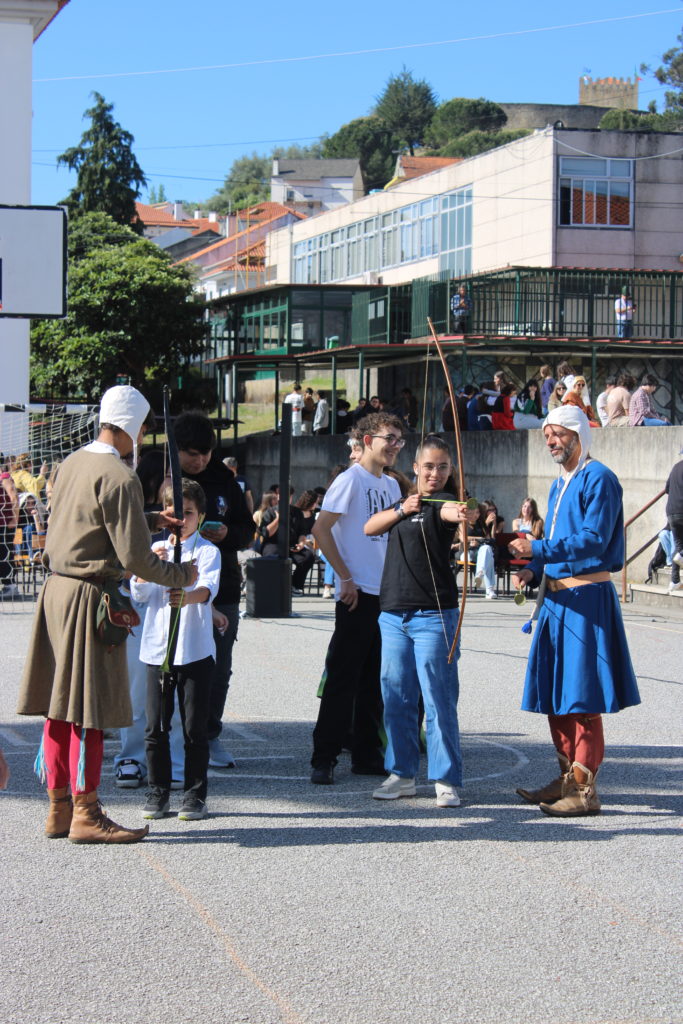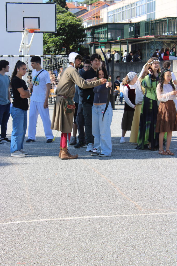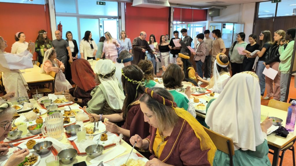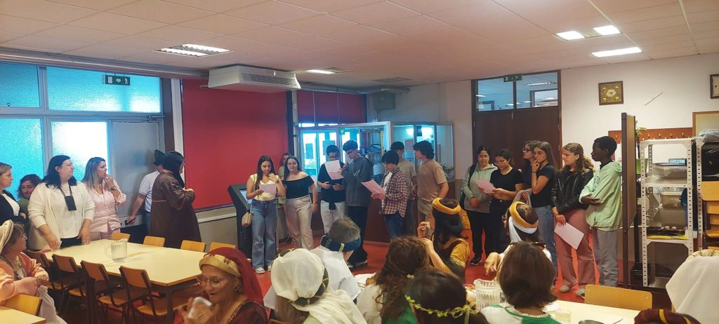 O tradicional Almoço Medieval reuniu alunos, docentes e não docentes, sendo acompanhado por momentos culturais, como a declamação de poemas na cantina, contribuindo para um ambiente de partilha e celebração.