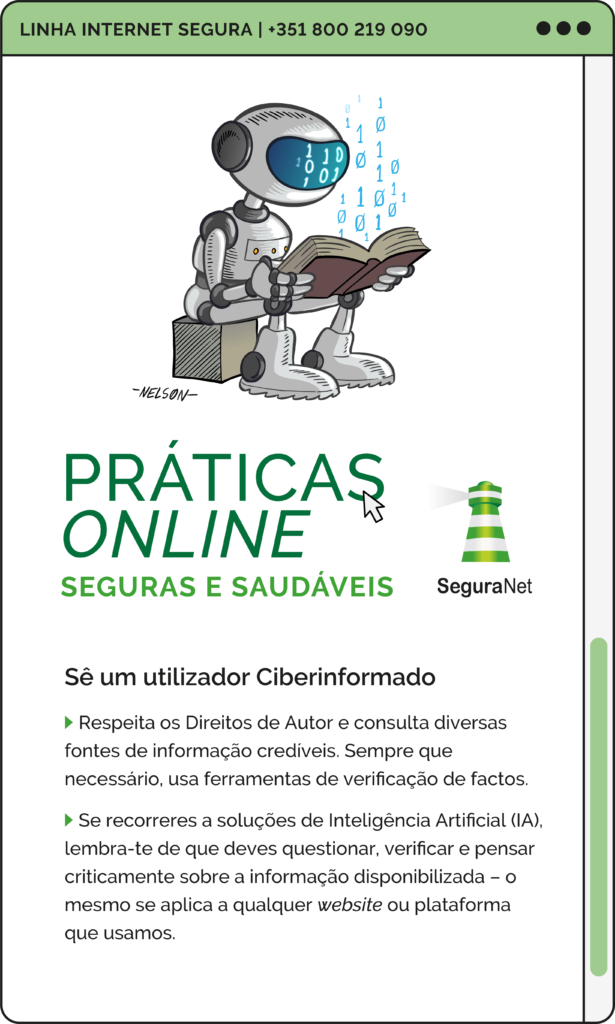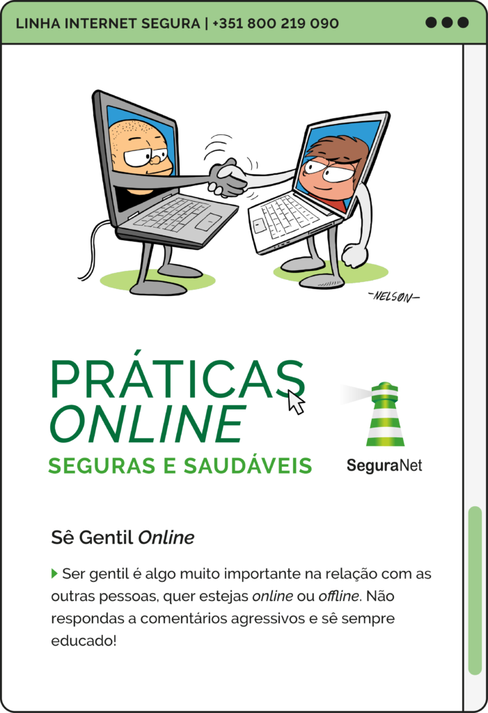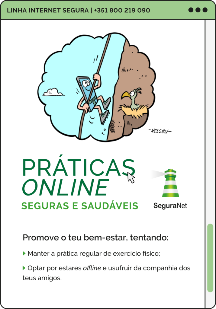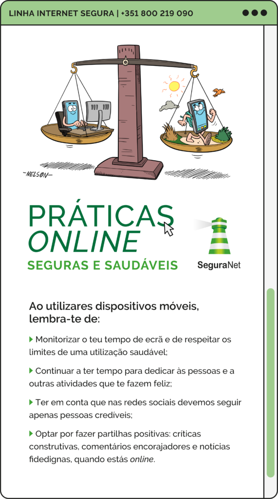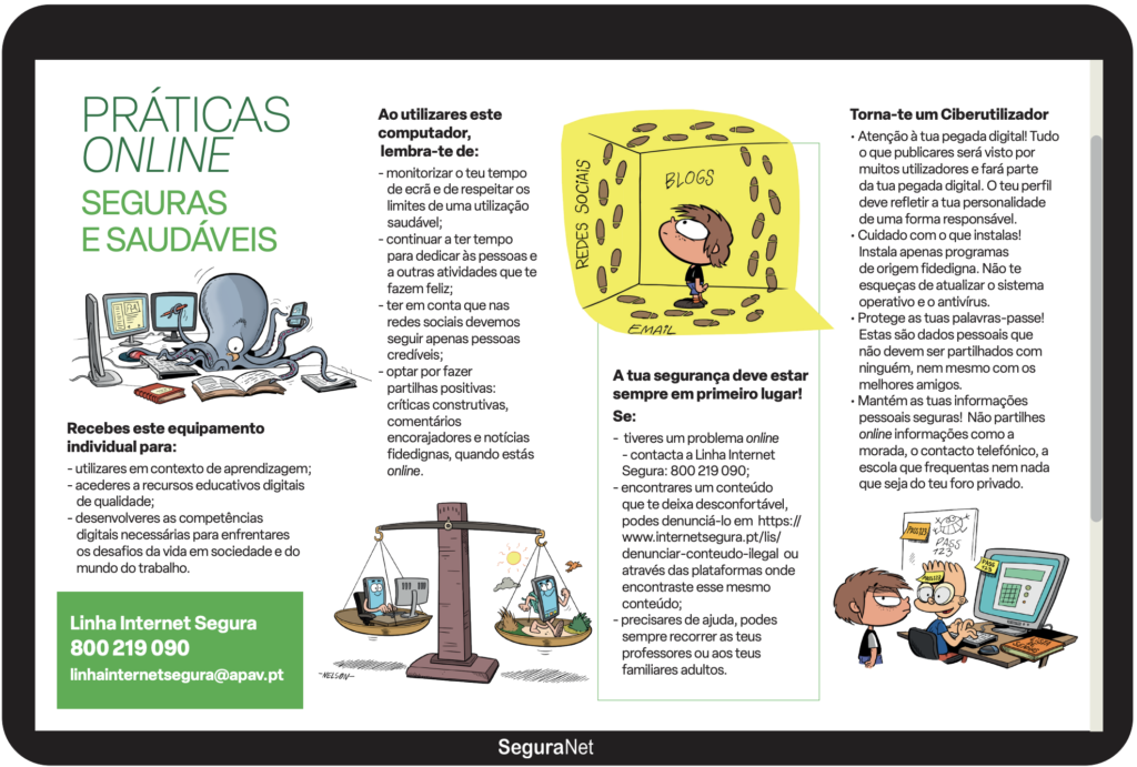 Campanha de sensibilização “Práticas Online Seguras e Saudáveis”, que visa alertar crianças e jovens para o uso seguro e saudável dos dispositivos móveis, em particular, dos computadores portáteis distribuídos pelo Programa Escola Digital. Estes dispositivos constituem um instrumento valioso para a aprendizagem, mas é imprescindível adotar práticas que promovam uma utilização saudável e produtiva dos mesmos.