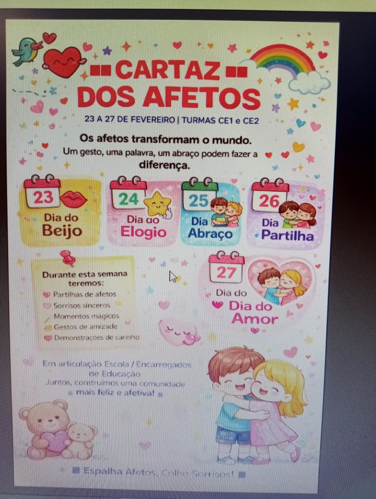 Ao longo da semana de 23 a 27 de fevereiro, as turmas do primeiro ano do Centro Escolar de Belmonte celebraram com entusiasmo a Semana dos Afetos, uma iniciativa que envolveu a comunidade educativa e as famílias. Nas turmas CE1 e CE2, durante cinco dias especiais-Dia do Beijo, Dia do Elogio, Dia do Abraço, Dia da Partilha e, por fim Dia do Amor- os alunos viveram momento únicos de carinho, amizade e aprendizagem. Pais, irmãos, avós, professores e assistentes operacionais juntaram-se às crianças nesta celebração, tornando cada dia mais significativo. Partilharam-se afetos, histórias, presentes, guloseimas.,. Houve abraços apertados, beijinhos carinhosos, elogios inesperados e mensagens trocadas entre colegas. Os pais surpreenderam com elogios e escondidos nas lancheiras e o correio chegou à escola com cartas; pequenos gestos cheios de significado que mostraram o quanto o amor se expressa em coisas simples. Ouviram-se histórias gravadas à distância (pais que não podiam estar), houve danças, cinema, poesia …